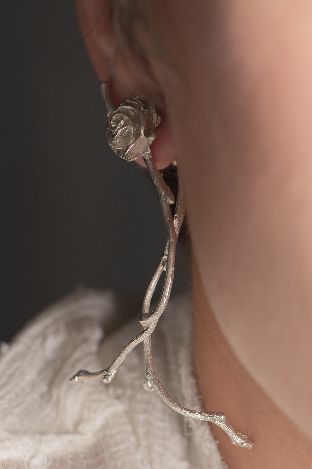 The second curved twig is worn behind the earlobe and can be removed.